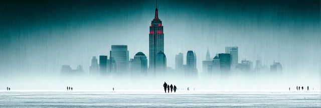 As if emerging from a poetic dreamscape, the iconic New York skyline pierces through a delicate curtain of frigid air and ethereal blue light. In this unforgettable canvas, the familiar contours of the Empire State Building ascend sharply, a red beacon casting a warm glow in a sea of icy hues. Far below, mere silhouettes against the stark, expansive foreground, figures traverse the frozen over waterway, lending a surreal quality reminiscent of adventurers exploring an otherworldly terrain. The misty atmosphere blankets the cityscape, transforming the bustling urban environment into a serene, suspended moment in time. This artwork masterfully captures the juxtaposition of human persistence against nature’s imposing stillness. The viewer is invited to linger, to delve into the quiet solitude and marvel at the resilience of both city and spirit in the grip of winter's frosty embrace. The delicate interplay of light and shadow, color and form, infuses this piece with a sense of wonder and introspection that transcends the mere physical location it depicts. It isn’t just a portrayal of a city; it’s a profound meditation on solitude, endurance, and the mystique of urban winters.