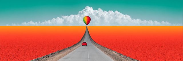 Immerse yourself in the invigorating essence of adventure with this stunningly surreal artwork that whisks you down an impossibly straight road cutting through a vividly colored landscape. A lone red car ventures towards the horizon where a solitary hot air balloon floats gracefully, its rainbow hues popping against the soft blue sky above an endless sea of radiant orange. The balloon symbolizes freedom and the thrill of exploration, perfectly contrasting with the grounded, reliable vehicle on its journey. This striking scene invites viewers to contemplate the harmonious blend of dreams and reality, symbolized by the juxtaposition of the balloon's weightless drift and the car's determined drive. The landscape, an infusion of natural and supernatural elements, encourages a moment of pause, a breath of fresh air in the viewer's day-to-day life. It serves as a metaphor for one's path through life—vivid, vast, and ripe with endless possibilities. Let this captivating image be a daily reminder of the beauty in the journey and the myriad adventures that lie ahead on the open road of life.