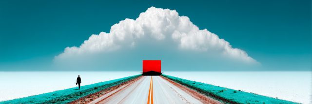 Immerse yourself in the enigmatic allure of "Journey to Infinity," a striking depiction of surreal and boundless landscapes where the ethereal meets the tangible. A lone figure, minuscule against the vast expanse, strides towards a monumental red cube that starkly contrasts with the serene azure of the sky and the sea. This visual narrative unfurls along a seemingly endless road that bisects the canvas, inviting viewers on a metaphoric trek towards the unknown. The road, dusted with an ephemeral trace of white, guides the observer's gaze towards the horizon, where earth meets the heavens in a soft, yet poignant embrace. The colossal cloud, pillowy and white, anchors the composition, adding a depth of scale and a touch of whimsy to the stark color palette. The implications of the red cube are manifold; it could symbolize challenge, destiny, or a beacon of profound truths waiting to be uncovered. This artwork not only captures a moment of contemplation and venture but also evokes questions about one's path and purpose in the vast tapestry of life. Each element—the azure backdrop, the pristinely white road, the enigmatic red cube, and the intrepid traveller—works in harmony to stitch a narrative that is as introspective as it is visually mesmerizing.