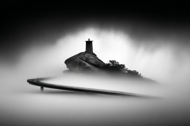 In an arresting display of nature's artistry, dense mists swirl around the stately silhouette of Chimney Rock, creating a scene that transcends reality. This monochromatic masterpiece captures the mystique of North Carolina's cherished landmark, enveloped in a dream-like fog that blurs the lines between earth and sky. The solid, enduring presence of the rock contrasts sharply with the delicate, ephemeral nature of the mist, symbolizing the timeless struggle between man and nature. The composition draws the viewer's eye across the ethereal landscape via a curving bridge that seems to float, leading to the solitary watchtower perched atop the massive boulder. Light plays a pivotal role here, its subtle gradation hinting at the unseen sun struggling to pierce through the heavy shroud of fog. The interplay of shadow and light, along with the soft, flowing textures of the mist, invites a contemplative mood, making this piece an intriguing invitation to explore themes of isolation, persistence, and the inherent beauty of untouched landscapes.