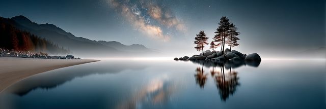 Under the vast expanse of the night sky, a serene lake lies cradled by the gentle embrace of distant mountains. The celestial dance of the Milky Way casts a silvery glow across the heavens, mirrored perfectly in the still, glassy waters below. The scene is set in a secluded natural haven, where a small cluster of pine trees on a rugged outcrop serves as the only witnesses to this nocturnal masterpiece. The calm surface of the lake reflects the starry sky with such clarity that it's difficult to discern where the sky ends and the water begins. Moonlight bathes the surrounding landscape in a soft, ethereal glow, highlighting the contours of the rolling hills and the dense forest in the distance. This dreamlike setting is not merely a backdrop but a dynamic canvas, inviting the observer to linger in the quietude of the moment. The deep blue hues and the cinematic lighting heighten the dramatic yet peaceful atmosphere, creating a perfect synthesis of wonder and tranquility. This image is an invitation to pause and reflect, a soothing escape into the beauty of the untamed wilderness at night.