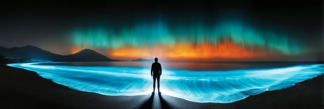 As twilight deepens and stars begin to freckle the vast canvas of the night sky, the shores of Puerto Rico awaken to a mystical dance of colors. The bioluminescent bays of the region, such as the famed Mosquito Bay, come alive in a luminous display of glowing blue hues that mirror the celestial majesty above. In this captivating image, a lone silhouette stands at the threshold of this ethereal phenomenon, gazing into the surreal horizon where the water's edge kisses a fiery gradient of dusk. The oscillating waves, infused with the natural light of tiny marine organisms, seem to draw paths of otherworldly glow, creating a stark, breathtaking contrast against the dark sands and silhouettes of distant mountains. This artwork not only captures the surreal beauty and tranquil mystery of these bioluminescent waters but also evokes the essence of human curiosity and our eternal draw to nature's wonders. The visual narrative transcends the mere aesthetic, inviting the viewer to ponder over nature's profound intricacies and the serene solitude that comes with standing at the edge of such untouched beauty.