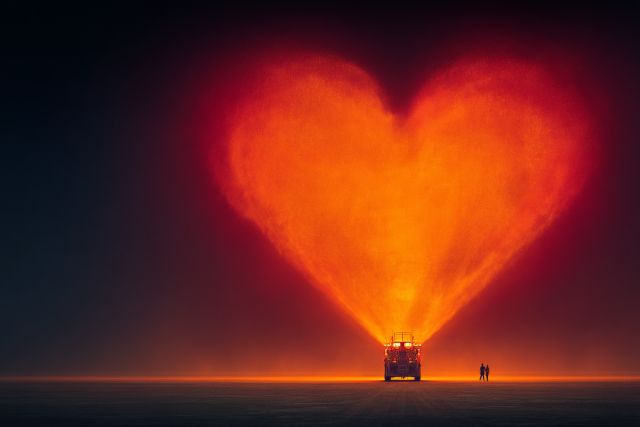 Illuminated against the crepuscular hues of a fading sunset, a heart-shaped beacon of fiery oranges and deep reds emerges, casting an enchanting glow across the expansive horizon. This image captures more than a moment; it encapsulates an emotion, mirroring the Burning Man festival's spirit, where art, human connection, and transient beauty converge. In the foreground, the silhouettes of two individuals stand side by side, dwarfed by the immensity of the glowing heart that lights up the dusky environment. This awe-inspiring scene reflects the unity and creativity celebrated at the iconic festival, evoking a sense of companionship amidst the vast, mysterious playa. The heart, ablaze and vibrant, serves as a surreal centerpiece in this artwork, symbolizing passion as well as the burning intensity of human connections forged under extraordinary circumstances. As the night falls, the vivid illumination from the heart creates a stark contrast with the dimming sky, a spectacle of color and light that invites contemplation about love, life, and art. The tranquility of the setting, combined with the dramatic visual, creates a powerful narrative about finding brightness in the darkest times, making this piece an unforgettable visual journey.