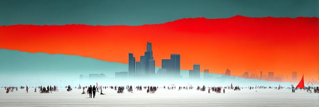 Embrace the audacity of art as it captures the Los Angeles skyline amidst a breathtaking, surreal environment that mirrors the vitality and mystique of the Burning Man festival. The landscape features a vast expanse of cool-white desert giving way to throngs of silhouetted figures, each contributing to the collective aura of this unique gathering. The city's famous skyscrapers rise starkly against an arresting swath of crimson and fiery orange, reminiscent of a sunset frozen in time, a dramatic backdrop that contrasts sharply with the starkness of the festival’s makeshift community below. This image celebrates not just a city, but a moment of cultural synthesis, where the urban landscape melds spectacularly with the transient beauty of human congregation and creativity under the banner of freedom and expressive unity. Through this lens, Los Angeles is reimagined not just as a bustling metropolitan hub, but as a canvas for radical artistic and communal endeavors, making tangible the ephemeral beauty of human synergy and the natural world’s colorful pageantry.