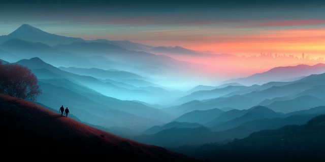 As the first light of dawn brushes the peaks of distant mountains, an enigmatic tapestry of colors unfolds across the horizon. In this captivating canvas, two hikers stand silhouetted against a realm of layered geographies talking shades of azure, violet, and a soft citrus glow that whispers of the sun’s imminent ascent. This minimalist yet profound depiction reverberates with the tranquility and vastness of the natural world, capturing a moment where time seems suspended. The skyline of San Francisco looms faintly in the far distance, blending seamlessly into this geometric abstract landscape. The subtle interplay of muted earth tones conjures a serene, almost otherworldly vista, where each ridge and trough tells its own silent story of aeons sculpted by wind and weather. The stark simplicity of the composition invites viewers to pause and reflect, allowing the mind to wander across the undulating terrains and into the depths of one's own thoughts. This piece, therefore, is not just a visual journey, but a portal to introspection and cosmic contemplation. This art print, with its sophisticated integration of natural landscapes and urban silhouette, makes a striking statement in any space, urging viewers to cherish the serene complexity of our world.