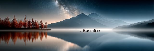 As darkness blankets the world, a mesmerizing scene unfolds by a calm mountain lake, where the cosmos spills its secrets in the form of a brilliant Milky Way arching across the sky. In the gentle embrace of dusk, two kayakers effortlessly glide over the still waters, their forms silhouetted against the luminous reflection of distant stars. Surrounded by a pine forest standing as silent sentinels, the lake acts as a perfect mirror, creating a symphony of light and darkness with the celestial show above. The stillness of the air and the muffled paddles slicing through the glassy water resonate with a calming rhythm, inviting viewers to pause and reflect on the vastness above and beyond. Rolling hills rise softly in the backdrop, bathed in the moon’s soft glow, adding depth and mystery to this nocturnal landscape. This imagery, deeply soothing yet alive with the whispers of adventure, evokes a sense of awe and wonder, reminding us of the infinite beauty of our natural world and our small place within it. The interplay of light and shadow, coupled with the expansive view of the cosmos, creates a dreamy and inspirational atmosphere that resonates deeply with the soul's longing for tranquility and the thrill of exploration.