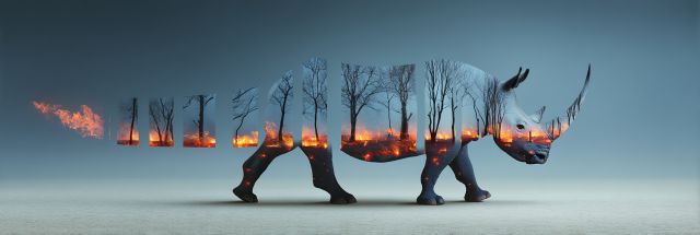In the captivating artwork, 'Forest Fire Fusion,' a surreal and poignant scene unfolds that stirs the imagination and grips the heart. A solitary rhinoceros, composed of clear, sky-filled silhouettes of trees, strides across a serene, muted landscape. Within its translucent form, a forest alight with the intense orange and red hues of a raging fire tells a story of nature’s beauty and vulnerability. Each step the rhino takes seems to carry the weight of the world, symbolizing the struggle against environmental destruction. The fire within this gentle giant burns brightly, suggesting a fierce determination to survive and thrive despite adversities. The striking contrast between the cool blues of the background and the warm inferno within portrays a world on the brink, yet the rhino’s calm demeanor offers a sense of hope and resilience. This piece not only serves as a visual feast but also as a powerful metaphor for the enduring spirit of nature amidst human-induced challenges.