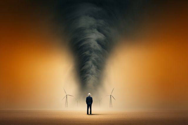 Under an expansive ombre sky, where the golden hues of dusk blend into a deep, mystic gray, stands a lone figure, a man donned in a suit and a bowler hat, reminiscent of an enigmatic traveler from another era. His gaze is fixed on the massive swirling tornado that rises with daunting power before him, its beastly form a stark contrast to the placid wind turbines lining the horizon like silent sentinels. The composition of the scene is a rich tapestry of contrasts and symbolism, inviting the viewer into a narrative that speaks to the human spirit’s confrontation with the forces of nature. The textures of the desert floor, painted with the soft brush strokes of twilight, stretch endlessly, suggesting both the beauty and the isolation of this surreal tableau. This artwork pulls you into a narrative that is as much a journey through external landscapes as it is an exploration of internal vistas. It provokes thought about man's small presence in the face of nature's overpowering forces, blending themes of resilience, solitude, and the relentless pursuit of meaning in a seemingly indifferent universe.