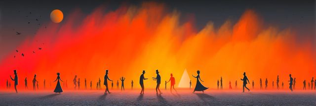 Amidst a magnificent backdrop of a burning horizon, silhouetted figures dance along a mysterious stretch of land that bridges day with night. Each character, a spectre against the orange blaze of the sunset, carries a tale woven into the fabric of their ethereal movements. Their elongated shadows stretch into the ebony of the foreground, playing tricks with light and contours in a visual opera of contrasts. As the sky kisses the sun goodbye, a fusion of fiery reds, deep oranges, and vibrant yellows bleed into each other, creating a canvas that resonates with the fervor of a distant, dream-like festival.