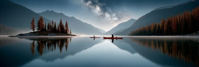 As twilight deepens over a serene mountain lake, two kayakers embark on a moonlit journey across its perfect, mirror-like surface. The scene unfolds in a secluded landscape, where the heavens bloom with a brilliant array of stars scattered across the vast expanse of the Milky Way. The distant rolling hills loom as darkened silhouettes, basked in the soft silver glow of moonlight. Around the lake, tall pines stand sentinel, their outlines softly blurred against the night sky. This captivating image invites viewers into a tranquil world where nature’s grandeur is displayed in breathtaking detail. The reflection of the sparkling stars on the still waters doubles the celestial spectacle, creating a symmetrical vision that mesmerizes and soothes the soul. This artwork not only captures the infinite beauty of the nocturnal outdoors but also inspires a profound sense of peace and wonderment. Amidst the vast quietude, the gentle strokes of the kayakers' paddles ripple through the water, adding a subtle, yet stirring element to the placid scene. This enchanting visual story highlights the delicate interplay of light and shadow, nature and human presence, encapsulating a moment both timeless and transient. Each aspect of the composition contributes to a harmonious symphony of colors and textures - the deep blues, the silvery whites, and the earthly tones of the forest create a palette that appeals to the senses and elevates the spirit.