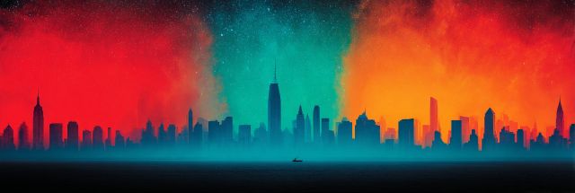 As dusk settles over the horizon, the New York skyline emerges as a breathtaking silhouette against an inferno of colors, where crimson melts into cobalt. This masterful portrayal transforms the iconic view into a vibrant spectacle reminiscent of the Burning Man festival's spirit of radical expression and decommodification. The artwork combines elements of reality and fantasy, encouraging viewers to perceive New York through a prism of imaginative possibility rather than mere concrete and steel.