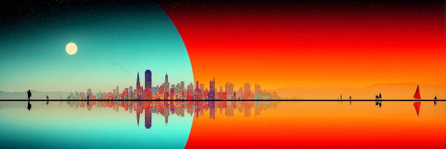 As the sun sets on the horizon, casting vibrant hues of deep reds, fiery oranges, and tranquil blues across the sky, San Francisco’s skyline emerges as a striking silhouette against the celestial drama. This imaginative depiction blends reality with the fantastical, drawing inspiration from the eclectic spirit of the Burning Man festival. The artwork embodies a metaphoric 'split'—half engulfed in the glow of twilight, while the other basks under a calm, moonlit night. Reflective waters mirror this duality, adding a serene depth that invites viewers to pause and reflect. The iconic structures that define San Francisco's skyline, from the Transamerica Pyramid to the Salesforce Tower, stand tall, their outlines softened in the artwork’s dreamlike quality. This piece is not merely a visual delight; it’s a narrative about the complexity and dual nature of urban life, celebrated through explosive color and tranquil shadows. Each viewing angle allows the observer to travel from the fervor of daylight to the tranquility of night, encapsulated within a single frame.