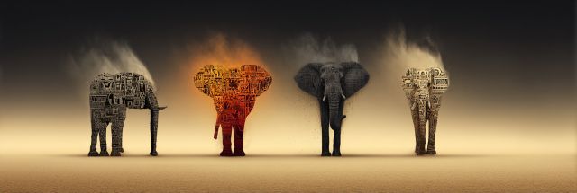 In an exquisite fusion of text and texture, this evocative artwork transports the viewer into a realm where the majestic wilderness meets human expression. Four elephants, each cloaked in an armor of words, march across a barren, golden landscape under a dream-like haze. The first elephant, crafted from newspaper clippings, carries stories of daily lives and fleeting moments; its skin a tapestry of urban tales. The second, emblazoned in fiery orange hues, seems to burn with the raw, intense energy of vital headlines and breaking news, invoking the spirit of urgent communications that captivate and consume. In stark contrast, the third elephant, adorned in classic monochrome, mirrors the timeless grace and enduring narratives that transcend generations, its presence a solid testament to history itself. Completing this quartet, the fourth elephant is a patchwork of small, meticulous print, suggesting the detailed, often overlooked stories that stitch the fabric of collective memory. Together, these giants stride towards a horizon that blurs into the infinite, their steps a silent yet powerful discourse on the impact of communication throughout the ages.