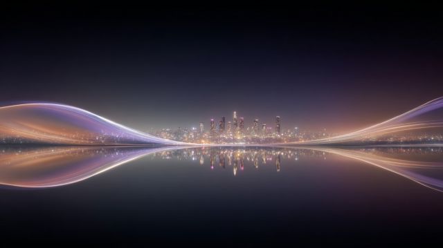 Under the enigmatic cover of night, vibrant and serene waves of luminescent particles caress the cityscape of Los Angeles. The view is breathtakingly futuristic, dominated by shimmering skyscrapers that touch the starless sky. This wide-angle portrayal dramatically merges the lines between reality and digital imagining, creating a serene yet powerful visual symphony. Subtle hues of neon blue and violet dance across the horizon, their reflections painting a soft symphony of colors against the dark waters that gently cradle the city’s silhouette. Infused with a sense of calm, the image transports viewers to a dreamscape where architecture and light perform in a flawless, choreographed exhibit. The composition is airy, with vast spaces of open sky and mirroring waters promoting a tranquil solitude amidst the bustling city life depicted. The narrative constructed here is not just one of visual appeal but an ode to the harmony between urban life and advanced technology—each building, each glowing dot, a testimony to innovation and elegance.