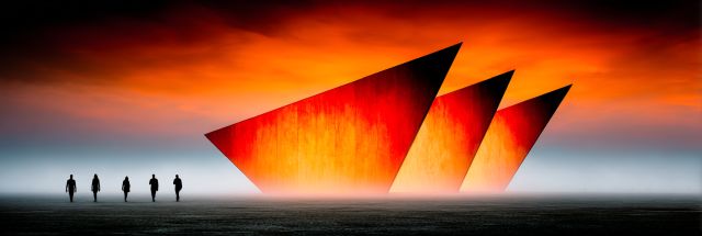 Amidst a vast landscape where the Earth meets a blazing horizon, colossal geometric forms rise like monoliths of an ancient civilization reborn in fire. The artwork stretches the bounds of perception, blending a stark symphony of colors that beguiles the mind and ensnares the senses. Fiery red and ember orange imprint themselves vividly against a deepening twilight sky, encapsulating the raw power and ephemeral beauty of nature’s elements. Figures march towards this spectacle, their silhouettes small yet significant against the monumental backdrop of color and shape. This canvas articulates a journey, both literal and metaphorical, echoing the communal and transformative spirit of the Burning Man festival.