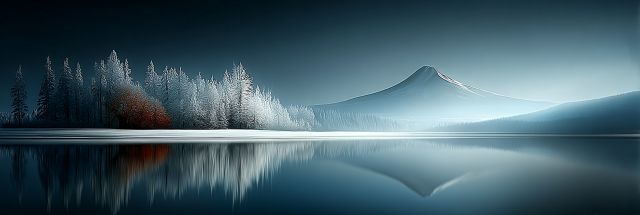 **As dawn breaks over the horizon, the serene waters of a pristine lake stretch out beneath a majestic snowcapped peak. The iconic Mount Hood stands sentinel in the distance, its presence both awe-inspiring and comforting amid the quietude of nature's embrace. Frosted trees line the shore, their branches dusted with the soft white of fresh snow, contrasting sharply with a few resilient splashes of autumnal color clinging to life. This canvas captures a moment of perfect stillness, where the world seems to pause and take a deep, refreshing breath.