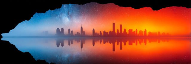 Fiery Sunset Silhouette: An Artistic Cityscape over Tranquil Waters