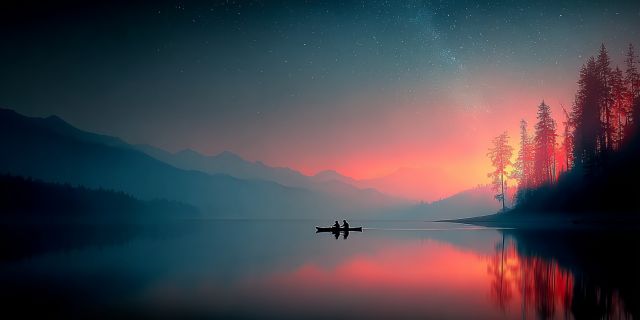 As dusk gives way to night, a breathtaking scene unfolds over a silent mountain lake that mirrors the awe-inspiring cosmos above. A duo of kayakers gently glides across this glassy expanse, creating subtle ripples that disturb the perfect reflection of a star-spangled sky and deep crimson horizon. The distant hills, shrouded in the mystery of twilight, stand guard around the lake, their silhouettes forming a stark contrast against the slowly darkening cerulean vault. Whispering pines at the water’s edge frame this magical vista, offering a sense of solitude and peace. The fading light of the sun, scattered by distant clouds, casts a warm glow that balances the cool blue tones of the evening, suggesting the lingering warmth of day. This painting captures not just the visual grace of a night at the lake but also evokes the tranquil sound of water kissing the paddles, the soft sighing of the forest, and the soulful quiet that accompanies such pristine natural settings. The artwork’s high-resolution detail and ultrarealistic depiction pull the viewer into a moment that is both ephemeral and eternal, inviting them to linger within this dreamy, otherworldly landscape.