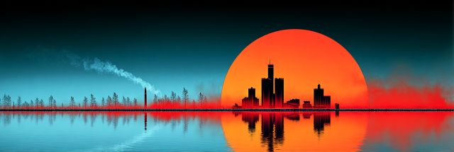In an evocative blend of fire and water, the Detroit skyline emerges as a stunning silhouette against a backdrop inspired by the vibrancy of the Burning Man festival. Dominated by a breathtakingly large, fiery sun sinking into the horizon, the scene captures the imagination with its dramatic contrasts and bold colors. The city's iconic structures, set against a spectrum ranging from deep blues to intense reds, reflect beautifully on the tranquil water, creating a perfect symmetry that mesmerizes the viewer. Mirroring the transformative spirit of Burning Man, this image transforms the familiar cityscape into a mystical tableau that speaks of renewal and infinite possibilities. The trees lining the reflective waters add a touch of serenity to the composition, tying the natural with the urban in a surreal, dream-like vision. This artwork ignites the senses, inviting onlookers to explore the depths of its colors and to contemplate the serene yet powerful presence of Detroit in a world that combines reality with fantasy.