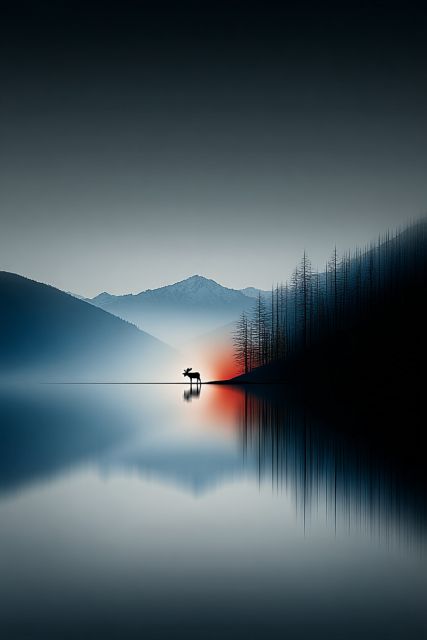 *** About Moose: The moose, a symbol of strength and solitude in wilderness iconography, features prominently in this artwork. These majestic creatures are known for their imposing stature and are commonly found in forested regions of North America, Europe, and Asia, particularly around water sources which are essential for their hydration and forage. Mooses are typically solitary animals with a strong territorial instinct, often depicted in art and literature as the gentle giants of the forest. This piece of art honors the moose, not only showcasing its physical elegance but also symbolizing the serene beauty of its natural, undisturbed habitats.