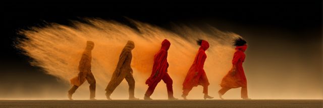 Under a golden haze that washes over the horizon, a line of figures emerges, draped in cloaks of earthy and fiery tones. The dusk light plays along their garments as they stride forward in unison, creating a captivating visual symphony of movement and color reminiscent of the Bohemian revelries one might encounter at events like the Burning Man. This piece of art, steeped in the ethos of freedom and self-expression, mimics the raw, palpable energy found at these gatherings. Each figure, outlined against the stark, minimalist background, seems to dance with the setting sun, their silhouettes intermittently blurred and sharpened by a wind that carries desert dust and the tales of a day ending. The vibrancy of the reds and oranges against the tranquil backdrop reflects the fiery passion of festival-goers who celebrate the arts, community, and nature. As the figures blend with the warm hues of dusk, viewers are invited to feel the pulse of music, the warmth of the gathered crowd, and the liberating rush of dancing without abandon in a shared space of creativity and connection.
