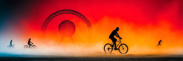 In an otherworldly spectacle of color and motion, the ethereal image captures an evocative scene reminiscent of the iconic Burning Man festival, yet with a mysterious, fantastical twist. Amidst a vibrant backdrop of fiery red and smoky orange hues, silhouetted figures emerge: cyclists and one playful airborne figure, each rendered with stunning clarity against the tumultuous color wash of the setting sun. To the left, the structures echo a sense of grandeur and mystical allure, resembling iconic art installations, their arches forming a stark contrast against the soft chaos of the sky. This artwork metaphorically rides the fine line between reality and fantasy, pulling the viewer into a narrative that feels both epic and intensely personal. As the cyclists move through this entrancing landscape, one feels the pulse of adventure and the liberating thrill of an unfettered existence against the cosmos. Each pedal stroke narrates a tale of exploration and freedom, while the airborne figure captures a moment of exhilarating abandon against the earth’s gravity. This canvas becomes a portal to a world where the rules of physics are bent and beauty reigns supreme in bold, saturated colors.