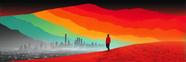 Amidst a world where the lively pulse of urban life meets the tranquil solitude of desert sands, "Vibrant Horizon" emerges as a masterpiece blending two distinct realms. This captivating canvas art melds the fiery hues of sunset-drenched dunes with a radiant, multicolored sky that boldly stretches over a meticulously detailed New York City skyline. The striking contrast between the serene desert foreground and the bustling urban backdrop creates a visual narrative of enigmatic allure. A solitary figure, cloaked in red, stands poised on the crest of the nearest dune, gazing out towards the distant city. This juxtaposition of natural and man-made environments not only enchants the viewer but also invokes a reflection on the profound connection and stark disparities between nature and human innovation. As the colors transition from warm reds to cool blues, they encapsulate the essence of a day's end and the welcoming of night over the city—an emblematic representation of time's ceaseless flow. Crafted with fine artistic details, every element of this artwork, from the silhouette of the observer to the sprawling city lights, is an invitation to explore the depths of one's interpretation and to feel the pulsating energy and calm, reflective silence simultaneously.