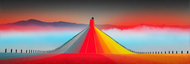 Vast stretches of vibrant hues unfold under a serene dusk, painting a path that promises awe and discovery. In this mesmerizing artwork, an open road, bathed in the fiery reds and soothing blues of twilight, extends towards a calling unknown. The horizon is a gentle blend of soft pinks and intense oranges, suggesting the raw beauty of nature during its most quiet moments. With every color transition, a new layer of the day's end is revealed, enchanting the onlooker. The presence of a solitary figure, cloaked in the mystery of sunset, adds a profound sense of solitude and introspection to the scene. The artwork captures the dual essence of motion towards the tranquil, yet vibrant beyond, captivating eyes and stirring hearts. It invokes a sense of both departure and arrival, a journey through the emotional spectrums as much as it is a travel along the physical realms. This visual feast isn't just seen; it's experienced, it resonates with the inner strings of those who seek beauty in unexpected corners of the world.