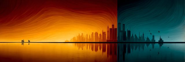 Like a canvas pulled taut across an eternal frame, the image unfurls a hypnotic dance of colors painted across the Detroit skyline. Reflections mirror the movement on the surface of calm waters, deepening the sense of serenity that the painting evokes. The left side of the artwork bursts with an intense orange-red palette, suggesting the radiant energy of the day's last light or the fiery passion of an urban sunset. This warmth transition over a fluid gradient to a cooler spectrum on the right, embracing a tranquil blue, reminiscent of twilight's quiet descent or the unending depths of the ocean at night. Each color plays off the other, not just complementing but also enhancing, giving the artwork a dynamic, almost living quality. The elongated ripples in the water add a touch of surrealism, while the silhouetted birds in the skies and the minuscule figures at the focal point of the divide, evoke our connection to the environment and the urban expanse. This depiction of Detroit is not just a visual experience but an emotional journey, inspiring reflections on nature, technology, and the human spirit interwoven through an evolving cityscape.