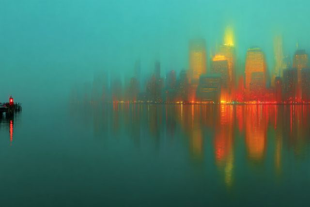 Under a cloak of tranquil soft sage green mist, the iconic New York skyline emerges as never before—a serene reflection on the placid water that it borders. This canvas captures a fleeting moment where modernity and mystery dance together in harmony. Vivid red and warm amber lights twinkle like distant stars, captured in the still mirror of the early morning waterway. The solemn silhouettes of monumental skyscrapers are softened, their edges blurred into the haze, suggesting the city's constant evolution between reality and dreams. As dawn breaks and the fog begins to lift, the city's restless pulse quickens again, yet this artwork forever holds it in a quiet, enchanted pause. Here, art and architecture converge; each skyscraper tells a tale of ambition and achievement, while the gentle hues invite contemplation and calming introspection. This vision is neither purely real nor entirely imagined but exists somewhere in between—capturing the essence of New York City's endless possibilities and its cloistered serenity during the rare moments of dawn.