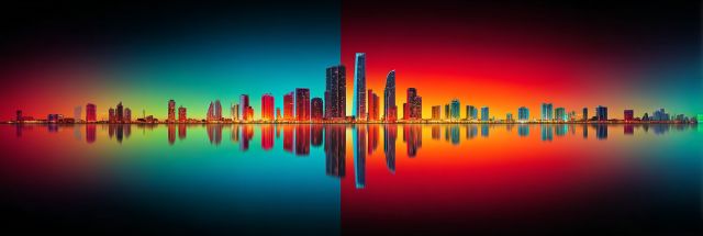 "Miami Skyline: A Vivid Tapestry of Colors Reflecting in Water"
