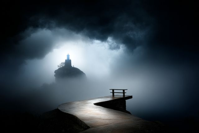 Bathed in the spectral glow of moonlight, this evocative image captures the serene yet enigmatic essence of Chimney Rock at North Carolina's famed Chimney Rock State Park. As the mist curls around its solitary peak, a lighthouse stands poised like a sentinel, casting a vigilant light over the obscured landscapes below. The pathway in the foreground curves enticingly, guiding the viewer's gaze towards this dreamlike beacon. Here, nature and mankind’s structures converge against the dramatic backdrop of stormy skies, suggesting tales of navigation, mystery, and the enduring allure of the untamed wilderness. The interplay of light and shadow across the scene weaves a dynamic tapestry of stark contrasts and soft nuances, inviting contemplation. This striking depiction not only honors the majestic beauty of this rugged landscape but also evokes a sense of timeless wonder, positioning the observer on the threshold of reality and the vast unknown. Each element in the frame, from the reflective path to the obscured horizon, works in harmony to evoke a feeling of isolation and introspection, making this piece a captivating homage to the enigmatic charms of natural landscapes.