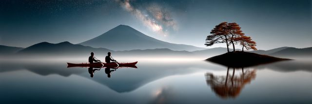 As the world quietly rests under the cloak of night, two adventurers glide effortlessly across a mirror-like mountain lake, their kayaks barely rippling the still water. Above them stretches a magnificent expanse of the Milky Way, painting streaks of silver across the indigo sky. This breathtaking scene transcends the mere visual, pulling the observer into a narrative of peace and exploration under the night sky. The distant hills lay shrouded in moonlight, creating a soft, ethereal glow that complements the sharp clarity of the stars. Near the shore, a solitary tree stands as a steadfast silhouette against the dreamy backdrop, its leaves whispering secrets of the night wind. The composition’s masterful juxtaposition of movement and tranquility invites viewers to linger, caught between the serene isolation of nature and the vibrant life above. Reflecting both the starry sky and the silhouettes of the kayakers, the lake serves as a portal to a world where time slows and the heart speaks the language of the wild. Every stroke of the paddle tells a story of adventure and contemplation, inviting one to delve deeper into the mysteries of the natural world, encouraging thoughts of what lies beyond the visible and reachable.