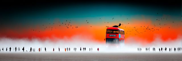 Amid an expansive canvas, a vivid portrayal emerges, capturing a moment of surreal interaction between nature and humanity. The image unfurls a scene set against a dramatically vast horizon where earth meets an inferno of sky. Dominating the midst of this fiery backdrop, a solitary double-decker bus stands, its bright red structure a stark contrast to the enveloping mist and the vibrant orange and red hues that bleed into each other above and below. Crowds of silhouetted figures converge towards this epicentral artifact, drawn inexplicably to its beckoning presence. The scene resonates with the spirit of iconic gatherings like Burning Man, where individuality and collective experience melt into a shared odyssey of artistic and existential exploration. Overhead, a solitary eagle soars, a symbol of freedom and the overarching dreams that unite participants in such symbolic assemblies. This artwork compels the viewer to contemplate the dichotomy of insignificance and belonging in the vastness of open spaces and crowded assemblies.