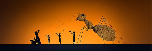 As dusk envelops the earth with its warm, golden hues, a striking and monumental ant sculpture arises, commanding attention against a vibrant orange sky. Rendered in an intricate mesh design, the silhouette of this remarkable artwork delights the onlooker, its scale dwarfing the human figures that gather in awe below. The scene, reminiscent of fervent celebrations from the Burning Man festival, evokes a sense of unity and wonder. Human silhouettes, distinct and lively, raise their hands towards the artwork, as if in joyous acclamation of the majestic creature that looms above. The crisp, clear contrast between the stark black figures and the fiery backdrop creates a visceral magnetism that pulls viewers into a narrative of celebration, mystery, and artistic mastery. Perhaps, these tiny spectators are creators themselves, marvelling at their immense creation under the vast, unending sky. The artwork not only captures a frozen moment of admiration and wonder but also incites contemplation about art, its impact, and the universal language it speaks across cultures and landscapes. This image, powerful and evocative, serves as a profound reminder of humanity's tiny presence amidst the grandeur of artistic expression and natural beauty.