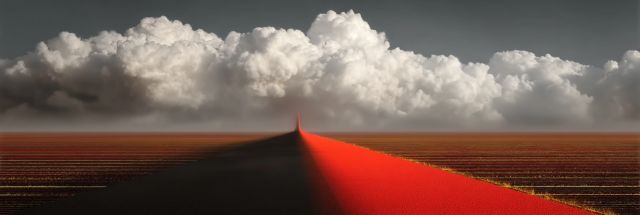 Visualize a journey across a bold, unending crimson path that slices through a boundless landscape, drawing the eye to a convergence of earth and sky. The artwork captures a scene where the stark, vivid line of a ruby road stretches into infinity, bordered by endless rows of subtle, earth-toned fields under a dramatic, expansive cloud-filled sky. The contrast between the red road and the overcast horizon evokes a sense of surreal exploration and wonder. The juxtaposition of the cloudy, tumultuous sky and the precise, straight path provides a captivating visual metaphor for the balance between chaos and order, challenge and pathway, journey and destination. As the clouds gather in a symphony of shadows and light, they seem to whisper tales of storms passed and the peace that follows. This print beckons viewers to contemplate the roads they travel and the skies they live under—inviting them to find beauty in persistence and the courage to continue forward on their paths. Perfect for those who seek to adorn their space with a piece that not only beautifies but also inspires profound reflection.