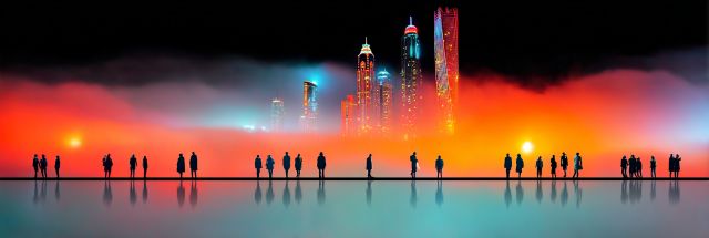 Under the ethereal glow of a crimson sunset, silhouettes convene along a reflective, mirror-like surface, observing the spectral display of a glowing cityscape that pierces the horizon. The skyline, an intricate tapestry of high-rise towers and shimmering architectural wonders, burns bright with hues of fiery orange and mellow indigos, reminiscent of the vibrant energy of a festival night. Each silhouette, a story untold, stands transfixed by the urban spectacle, their outlines casting ephemeral shadows that play with the liquid canvas beneath their feet. This striking tableau invites viewers into an immersive experience—a moment frozen where time, art, and the human narrative converge. The interaction of light and shadow, combined with the stark contrasts between the vivid skyline and the subdued observers, crafts a mesmerizing scene that teases the senses and ignites the imagination. The artwork serves not only as a visual journey through an urban festival of lights but also as a profound commentary on the collective human experience in the face of awe-inspiring cityscapes.