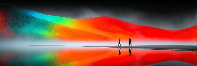 A mesmerizing tapestry of vivid hues unfolds across the serene expanse of Spotted Lake, where a couple strolls, ensconced in a world that bridges reality and fantasy. This striking canvas invites the viewer into a surreal landscape infused with the spirit of the Burning Man festival, echoing themes of exploration and dreamlike wonder. The bold reds and soothing blues bleed into one another, creating a fluid interplay of light and reflection that mirrors the lake’s natural mineral formations and cultural lore. As the couple walks, their silhouettes cast long shadows over the colorful palette of the earth, their figures small yet poignant against the vast, dramatic backdrop. This artwork not merely captures a moment but evokes a feeling of otherworldly escape and intimate connection with nature’s mystical side. The stark contrast between the vibrant land and the subdued sky intensifies the emotional depth of the scene, urging one to ponder the delicate balance between human existence and the wild, untamed beauty of British Columbia’s hidden gem.