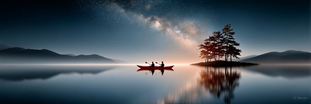 Imagine paddling through a mirror-like lake under the expansive canopy of the night sky, aglow with the Milky Way’s cosmic brilliance. This tranquil scene captures two adventurers in a kayak, enveloped by the quiet majesty of a calm mountain terrace. The distant silhouette of rolling hills bathed in soft moonlight adds a layer of mystique to the landscape. An island punctuates the reflective waters, hosting a small grove of pine trees standing resilient and serene against the starry expanse. The expert composition of the photograph evokes a profound connection to the natural world, encouraging a contemplation of the vastness above and the serene beauty below. The alignment of elements, from the gleaming astral bodies above to the gentle, rhythmic ripple around the kayak, creates a symphony of stillness and motion—a photographic ballet of natural harmony. Through precise, ultrarealistic details from the rippling water to the textured pines, the artwork invites viewers to immerse themselves into this dreamlike vista, offering a respite from the daytime's tumult.