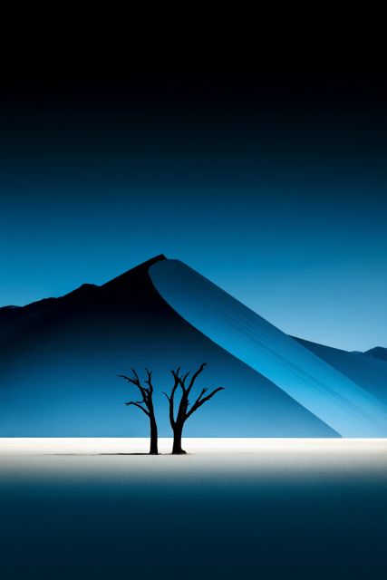 Enveloped in an ethereal twilight, an ancient tree stands sentry atop the pristine white sands of the Namib Desert, set under an expansive cerulean sky. The cool hues of blues gracefully transition into the darker silhouette of a towering dune; its crest sharply defined, suggesting the unyielding strength against the whispering desert winds. This stunning tableau invites the viewer to explore the quiet drama of isolation and endurance evidenced by the lone, leafless tree, its branches reaching out as if in supplication or celebration of its harsh, beautiful surroundings. The minimalist landscape, with its stark colors and dramatic lighting, evokes a sense of solemnity and awe, capturing the spirit of the desert in a simple yet profound composition. This artwork not only highlights the raw beauty of southwestern Africa’s coastal desert but also symbolizes the resilience and adaptability of life in one of the earth's most extreme environments. As the shadows lengthen and mingle with the dying light, the scene becomes a powerful testament to solitude and survival in nature’s vast gallery.