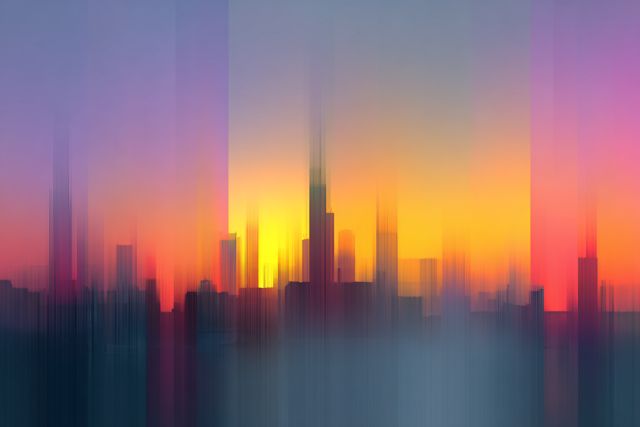 As the sun dips below the horizon, the iconic Chicago skyline emerges as a captivating silhouette against a canvas painted with vibrant gradients. This abstract representation, a blend of minimalism and smooth shadow effects, transforms the bustling cityscape into a tranquil tableau that evokes peace and introspection. Each stroke of soft color transition pulls the viewer into a realm where the vivaciousness of city life meets the serene flow of nature’s own artistry. The glowing hues of orange and pink sky meld seamlessly into the cool blues and purples, crafting a dreamlike vision that resonates with the soul of Chicago. The composition's clean lines and subtle colors lend an air of sophistication and modernity, making this piece not just a visual treat, but a profound commentary on the intersection of urban vibrancy and artistic expression. The artwork captures the essence of Chicago’s architecture, not through intricate detail, but through the emotional response it inspires. Here, the city is more than just buildings; it is a living, breathing entity that pulsates with energy, yet also capable of profound calmness and beauty.