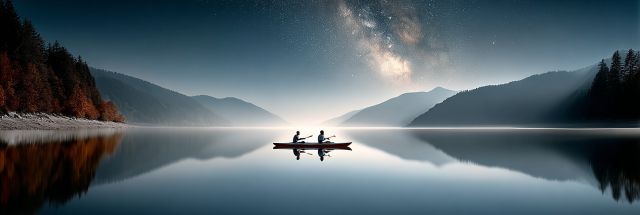 In the tranquil embrace of night, two kayakers glide effortlessly across a mountain lake, mirrored perfectly beneath a breathtaking expanse of the Milky Way. The scene unfolds in a secluded valley, where the stark silhouettes of pine-clad hills stand guard under a diamond-studded sky. The celestial display above casts a gentle luminescence, carving light into the velvety darkness and illuminating the water's surface with a spectral glow. This otherworldly vista captures the profound silence of the wilderness at night, broken only by the soft paddle strokes of the kayakers disturbing the glassy calm of the lake. The composition invites the viewer into a narrative of adventure and introspection, a momentary escape into the natural world's quiet grandeur. Each element, from the strategically placed kayakers in the foreground to the sprawling cosmos above, is framed to draw the eye into this meticulously balanced panorama. As emotions stir within the soul, this image serves as a poignant reminder of nature’s ability to awe and inspire, encouraging a deeper connection with the universe's mysterious beauty.