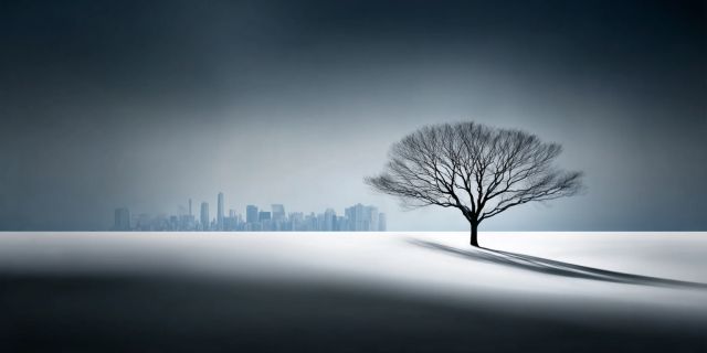 In an ethereal landscape of minimalistic beauty, a lone tree stands under the expansive cold canopy of a winter sky. Its branches, bare and stark, stretch outward in a poignant silhouette against the distant urban skyline, where the jagged contours of skyscrapers pierce the horizon. The soft white blanket of snow underfoot adds a serene uniformity, interrupted only by the sinuous shadows cast by the tree's outstretched limbs. This scene, a striking blend of natural simplicity and urban complexity, evokes a sense of quiet introspection.