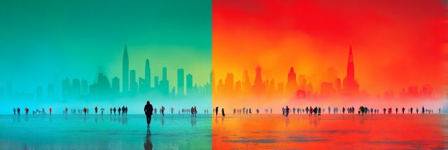 Immerse yourself in a kaleidoscope of vivid colors that seem to set the city skyline ablaze; this artwork is not merely a depiction, but an evocation of mood and imagination. At first glance, the left side of the canvas swathes the urban contours in a serene palette of cooling turquoise and blues, suggesting the calmness of an early morning. Mirroring this tranquility, the right explodes with fiery reds and oranges, drawing the mind to the intense energy of a sun setting or the fervor of a bustling city festival. Here, figures dot the landscape, some in solitude, others in clusters, moving through this digitally altered reality with an almost ethereal presence. Each silhouette interacts with the space, their shadows stretching into infinity on the reflective ground, suggesting both the anonymity and shared human connection within a city's expansive bounds. The contrasting atmospheres perhaps signify the multifaceted character of urban life—peaceful mornings against vibrant nights, solace against celebration. This artwork challenges the viewer to dive deep into the emotional and visual depths of city life as seen through an artistically disruptive lens, blending day and night, calm and chaos into a single harmonious scene.