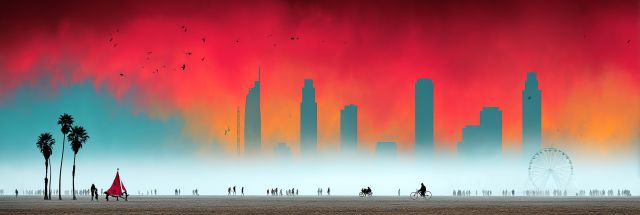 Amid the expansive beaches that skirt the vibrant city of Los Angeles, an immersive tapestry unfolds under a sunset ablaze. This canvas art casts a new interpretation of LA's iconic skyline through the imaginative lens of the Burning Man aesthetic. The scene is a dramatic juxtaposition of nature’s serene expanse against man-made marvels, painted in fiery reds and deep oranges that bleed into a tranquil azure sky. Silhouetted palm trees sway gently, framing this bustling urban vista, while the scattered human figures and cyclists add a notion of everyday life continuing under the majesty of the celestial transformation. A lone tent, reminiscent of a nomadic shelter seen at festive grounds, gives a nod to the spirit of adventure and gathering. This artistic rendition invites viewers into a surreal landscape where the boundaries between reality and creation blur, crafting a moment frozen in time where the city’s renowned architecture dances under a sky lit by nature’s vivid palette. The presence of the iconic Ferris wheel, a playful silhouette in the horizon, hints at an ever-present sense of fun and escape. This image is not just a display of artistic creativity but a vibrant sanctuary that captures the soul of Los Angeles and the essence of one of its most mythical cultural phenomena.