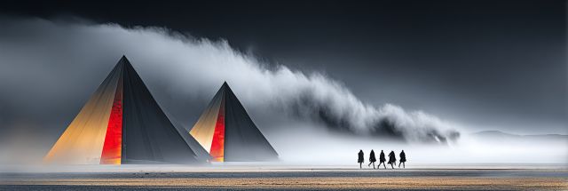 A trio of imposing, triangular structures emerges from the barren landscape, their sharp lines contrasted dramatically against a backdrop of rolling fog. Illuminated from within, each edifice glows with a fiery red light, beckoning to travelers venturing across this surreal desert. The somber grays of dawn paint the sky, as billowing clouds flirt with the idea of a tempest. small group of silhouetted figures advances towards these geometric beacons, their journey engulfed in mystery and anticipation. The scene encapsulates a moment frozen in time, where man's creation and nature’s untamed beauty converge into a poignant tableau of exploration and wonder. Visually compelling and emotionally stirring, this artwork transports the viewer to a place beyond the ordinary, suggesting themes of discovery, isolation, and the eternal human quest for meaning in the vastness of nature.