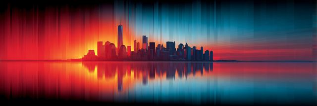 Indulge in the mesmerizing tranquility of a spectacular sunset washing over the New York skyline. This artwork captures an exquisite panorama where the calm ocean mirrors the fiery hues of dusk, blending seamlessly with the city's iconic silhouettes. Created in the spirited style reminiscent of the Burning Man festival, the piece pulses with a dynamic interplay of color and light. Vibrant reds and soothing blues streak across the canvas, symbolizing the city's energetic pulse and serene retreat. The horizon melds water with sky, allowing the observer to drift into a realm of reflection and peace. As the daylight fades, each building in the skyline, from towering skyscrapers to steadfast monuments, is dipped in a golden glow, resonating with the promise of the bustling night life yet to unfold. This canvas encourages viewers to pause and contemplate the dual nature of existence — vibrant yet peaceful, dynamic yet still. It is a tribute to New York’s enduring charm and its ability to inspire awe through its architectural grandeur and atmospheric beauty.