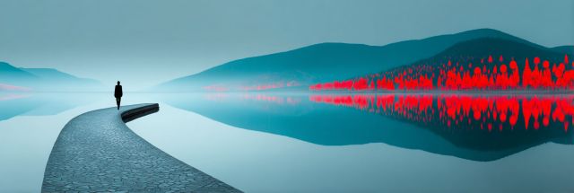 Under the quiet sky of British Columbia, Spotted Lake transforms into a surreal dreamscape, its waters mirroring the sky's embrace in hues of deep cerulean. A lone figure, silhouetted against the vast horizon, traverses a serpentine path which cuts through the glassy calm of the lake. The scene bursts in striking, fiery red that fringe the lake edges, reminiscent of flickering embers—a vivid invocation of the Burning Man festival's dynamic spirit. Here, nature and the transformative energy of art merge to create an otherworldly vista that beckons viewers to explore the unseen and the unexplored.