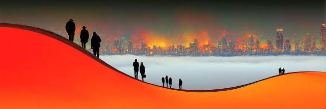 Imagine stepping onto a smooth, undulating surface that stretches into the crimson horizon, where the earth meets a city ablaze with colors. This stunning visual composition transports viewers to a dreamlike scenario that evokes the spirit and enigma of the Burning Man festival juxtaposed with the mesmerizing skyline of a vibrant city. Delicate mists fog cuddle the landscape beneath, creating a fabled bridge between the real and the surreal. Figures stand and walk along the vibrant curve, each silhouette a silent storyteller adding depth and emotion to the narrative. The landscape lights up with hues of amber and crimson, blending warmth into the cool twilight. As the city glows fervently in the distance, it beckons onlookers to delve deeper into its mysteries, promising untold stories and hidden whispers among its glowing edifices. This scene not only captures the essence of a place but also ignites the imagination, turning the familiar urban skyline into a canvas of fantasy and wonder.