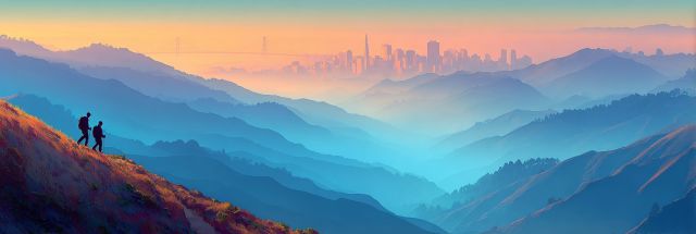 Hikers Overlooking San Francisco Skyline at Dawn: A Canvas of Colors